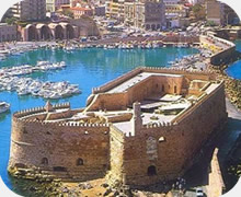 History is very much alive in Heraklion just like in most Greek cities. The central square while surrounded by cafes, stores and restaurants, is dominated by the fountain of the Lions, built by Morozini the Venetian governor in 1628. The Town Hall, is today housed in the Venetian Loggia, a building from the same era. At the end of the central market is a coffee house, housed at the "Koubes" a fountain built by the Turks when they converted the nearby church of the Saviour to the Valide mosque. All around the old part of the city ,the visitor can walk following the old Venetian walls that meet at a bastion, called "Koules", that dominates the old harbour of the city . __________________________________________________________________________ |