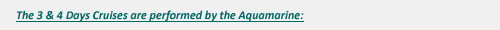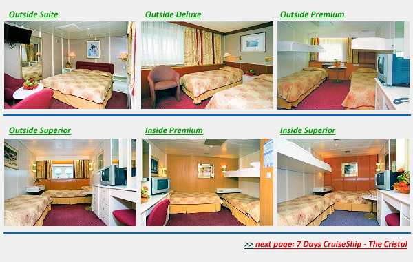 The Aquamarine is a stylish, modern and comfortable greek cruise ship. Aquamarine can accommodate up to 1268 passengers in 525 cabins ranging from spacious suites to great value cabins. The on board facilities include a sun deck, swimming pool, massage/sauna facilities, gymnasium, basketball & volleyball court, children's club, card room, Internet corner, casino, restaurant, bars, lounges, disco, beauty salon, duty free shop & doctor on board. All indoor public areas and cabins are conditioned using fresh air. |